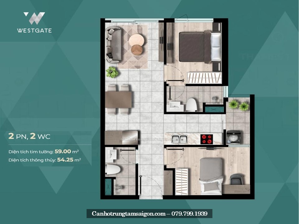 • Căn hộ 2 Phòng ngủ 2 toilet – 59m2