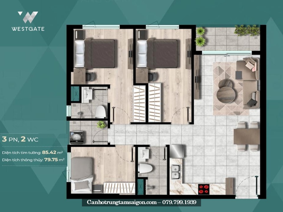 • Căn hộ 3 Phòng ngủ 2 toilet – 85m2 (căn góc)