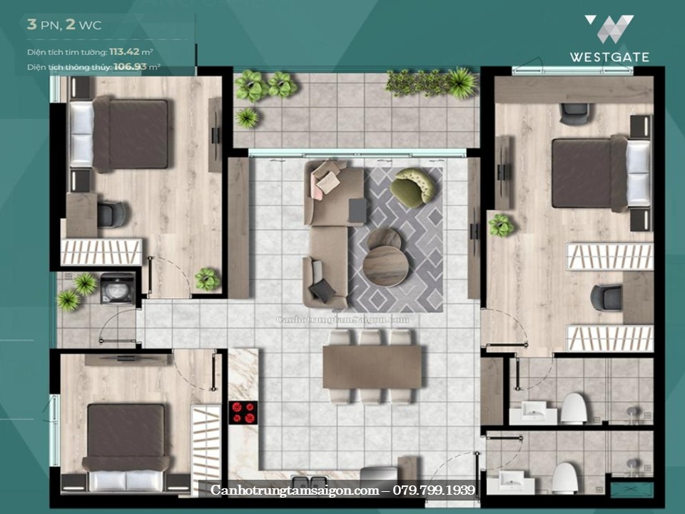 • Căn hộ 3 Phòng ngủ 2 toilet – 114m2 (căn góc)